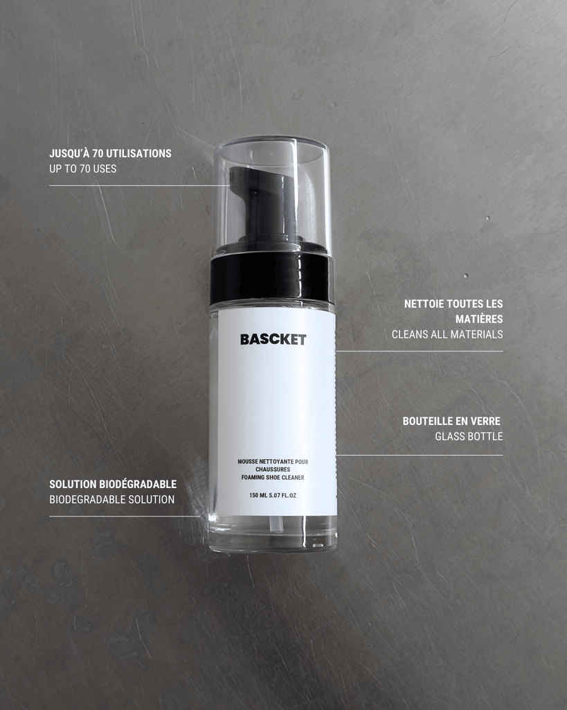 Bascket Shoe Cleaner is free of harsh chemicals. This plant-based solution is phosphate-free, 100% biodegradable and gentle on the skin.